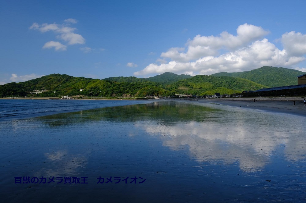 最後に唐津湾の海岸です。海に山と雲が綺麗に写り込んで見えました。